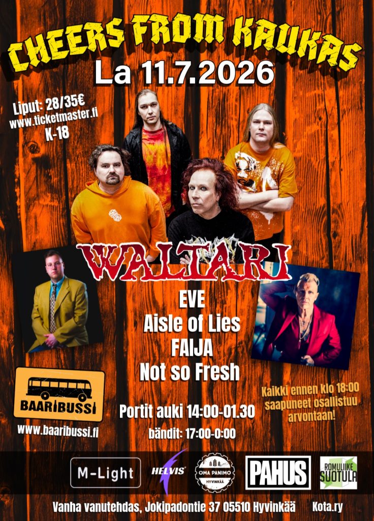 Cheers from Kaukas festarit tarjoaa tänäkin vuonna viihtyisän yhden päivän musiikkitapahtuman Hyvinkään Kaukasissa. Tapahtuma paikkana toimii vanhan tehtaan piha-alue. Tarjolla ruokaa ja juomaa. Live musiikkia klo 17.00-0.00 kelloajat ovat noin: Not so Fresh 17.00-18.00, Faija 18.30-19.45, Aisle of Lies 20.00-21.00, Eve 21.00-22.00 ja Waltari 22.30-00.00. Kaikki ennen klo 18.00 saapuneet osallistuvat erilaisten tuotepakettien arvontaan. Bussi kuljetukset hintaan 6€/ suunta tai 10€ meno-paluu (maksu ainoastaan bussikuskille). Reitti: Hyvinkään rautatieasema- Jokelan asema- Kaukas klo.16:00 ja 17:00. Sekä Kaukas- Jokelan asema- Hyvinkään rautatieasema klo.00:30 ja 1:30. Autolla saapuvat, pysäköinti Hortex yrityksen pihalle Vanuntie 61.